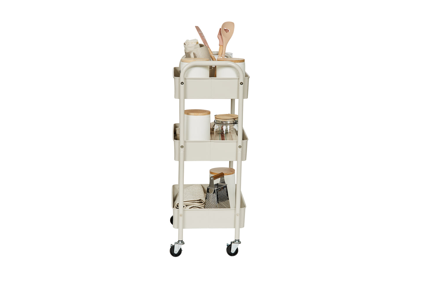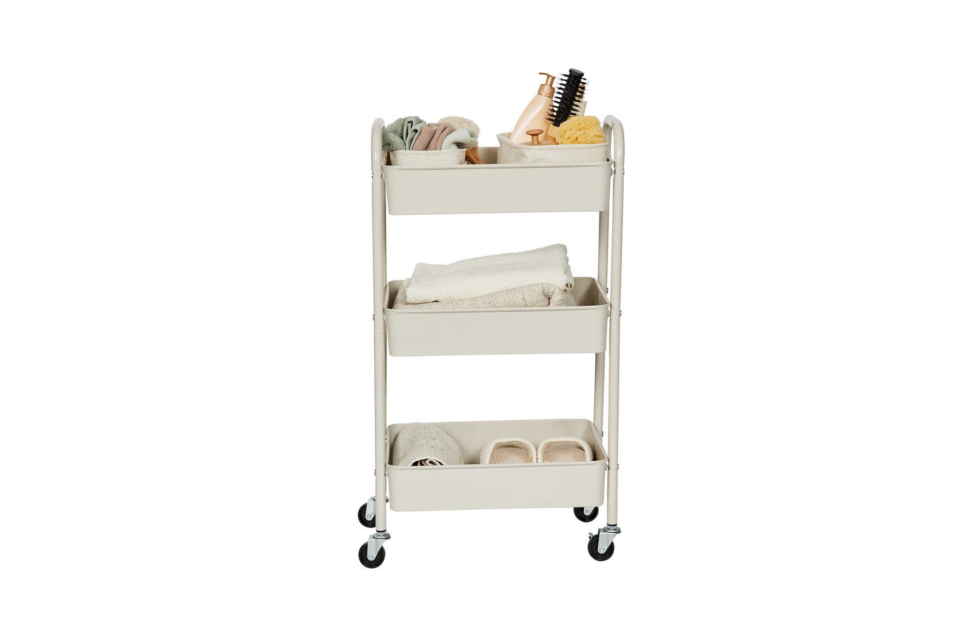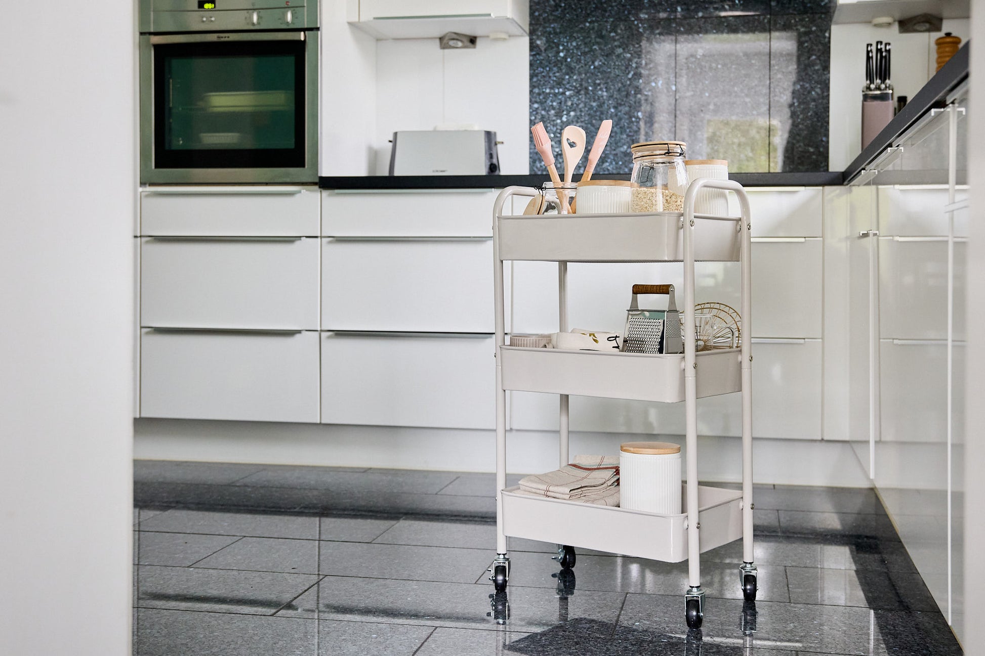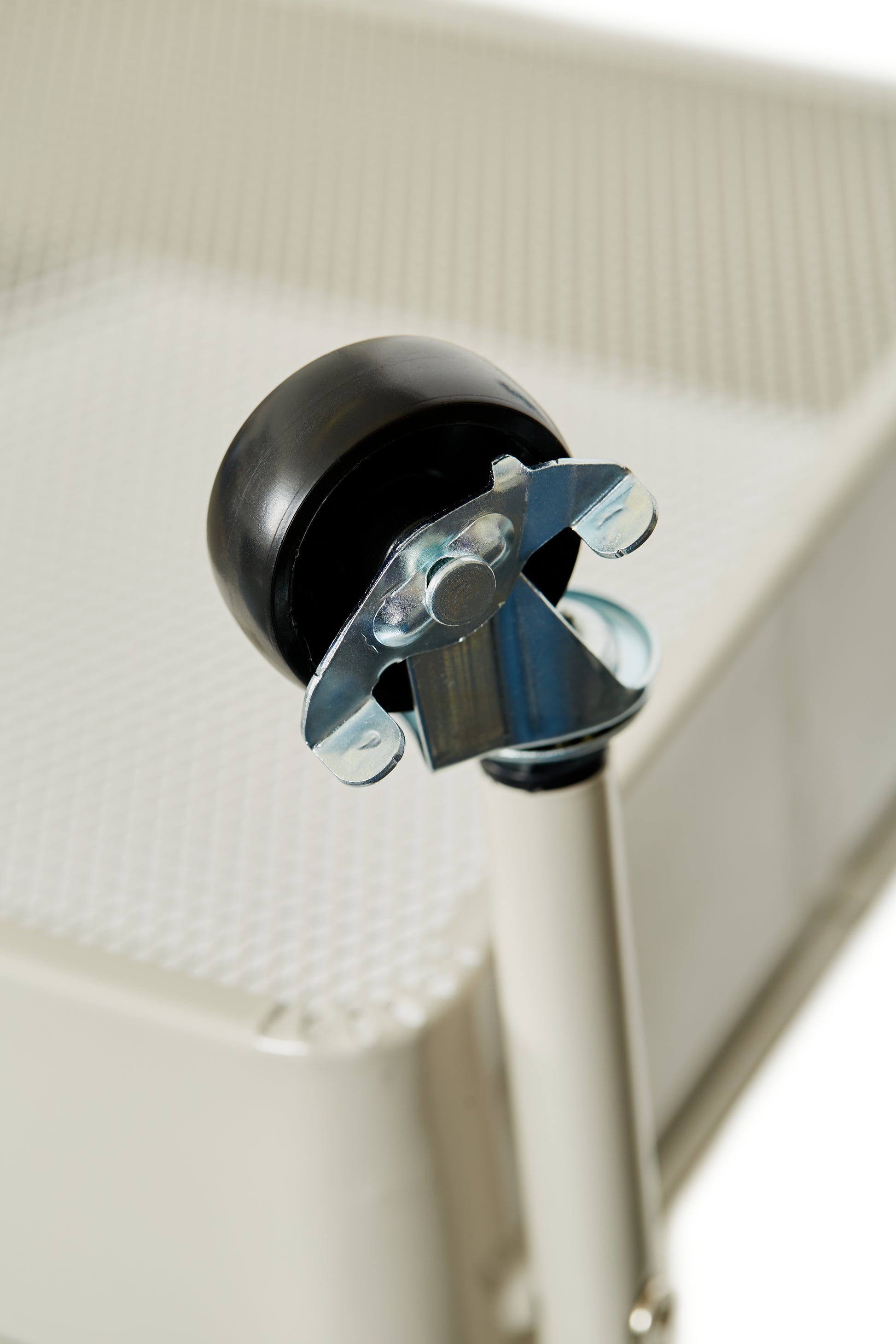 This 3-Tier Rolling Cart in grey is the perfect organizational solution for any space. With three spacious tiers, it offers ample storage for various items. Its sturdy construction and mobility make it ideal for use as a kitchen or bathroom cart, or for holding office supplies.