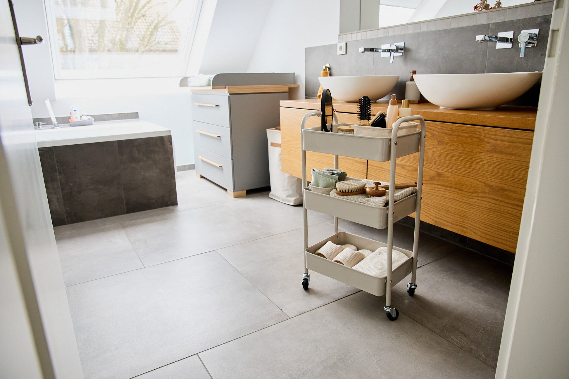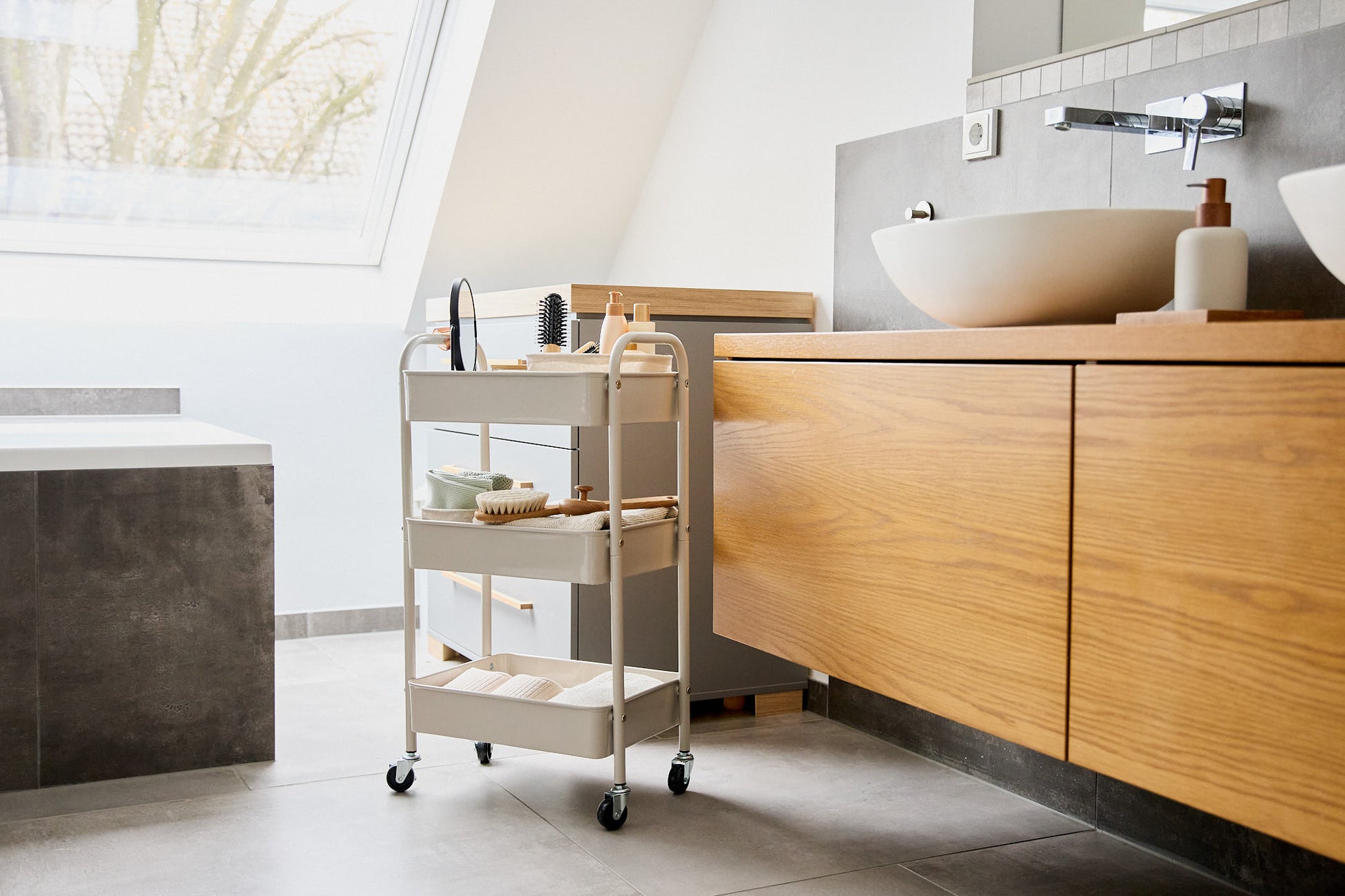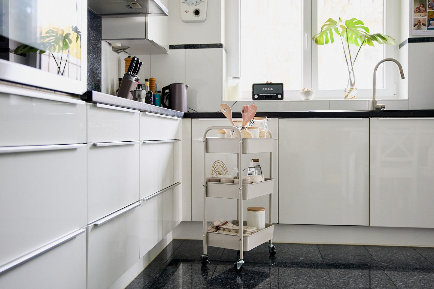 This 3-Tier Rolling Cart in grey is the perfect organizational solution for any space. With three spacious tiers, it offers ample storage for various items. Its sturdy construction and mobility make it ideal for use as a kitchen or bathroom cart, or for holding office supplies.