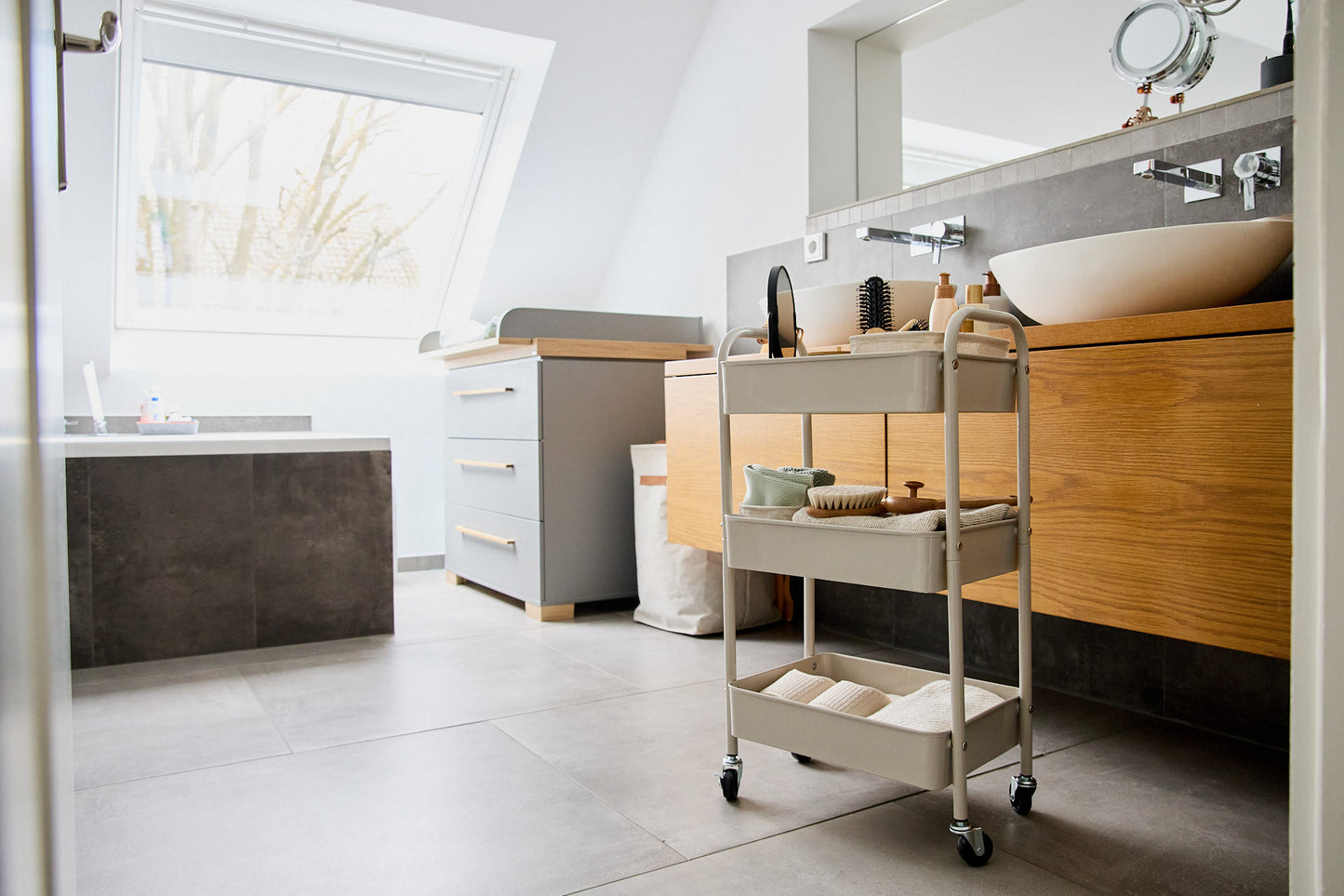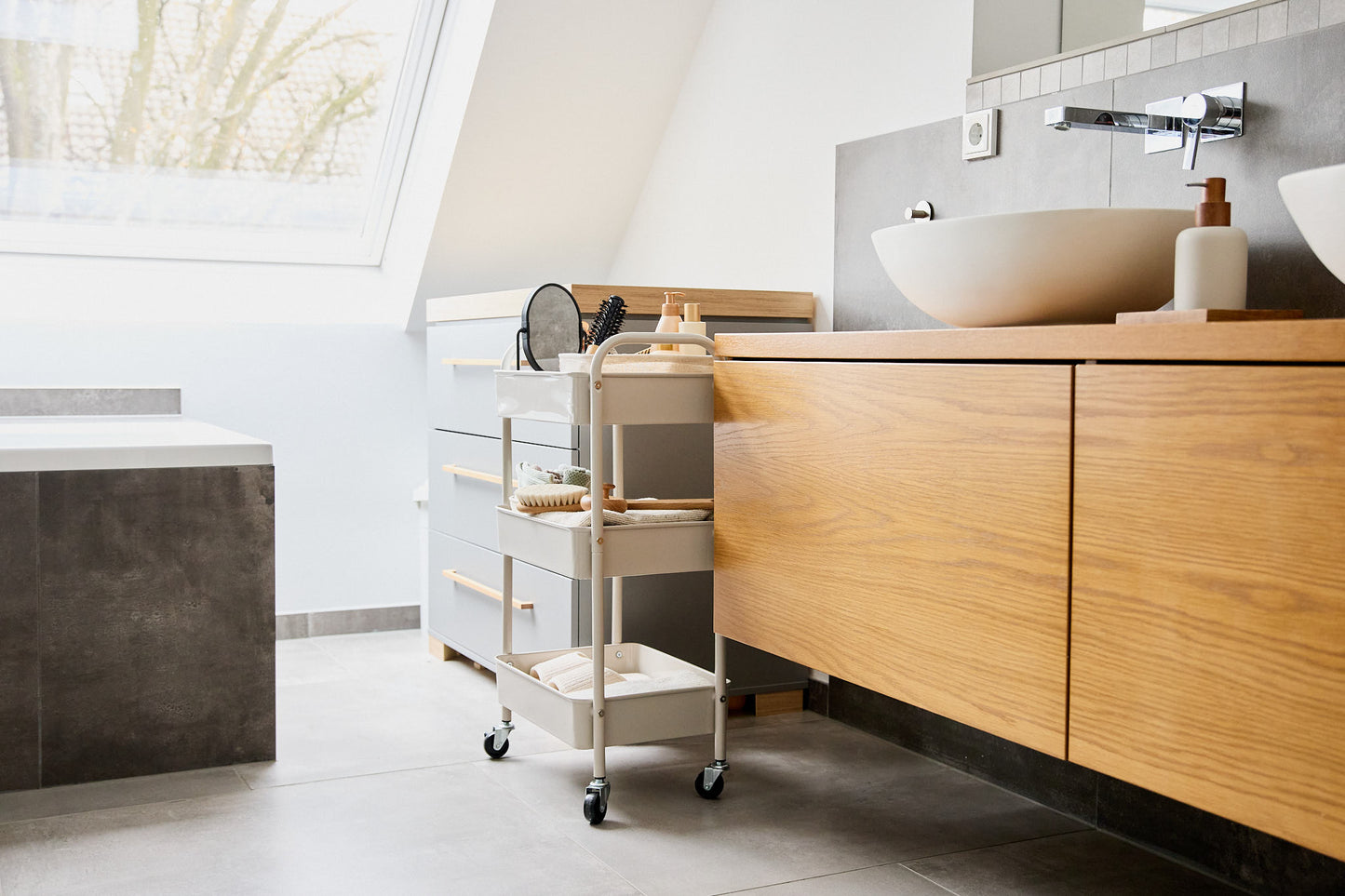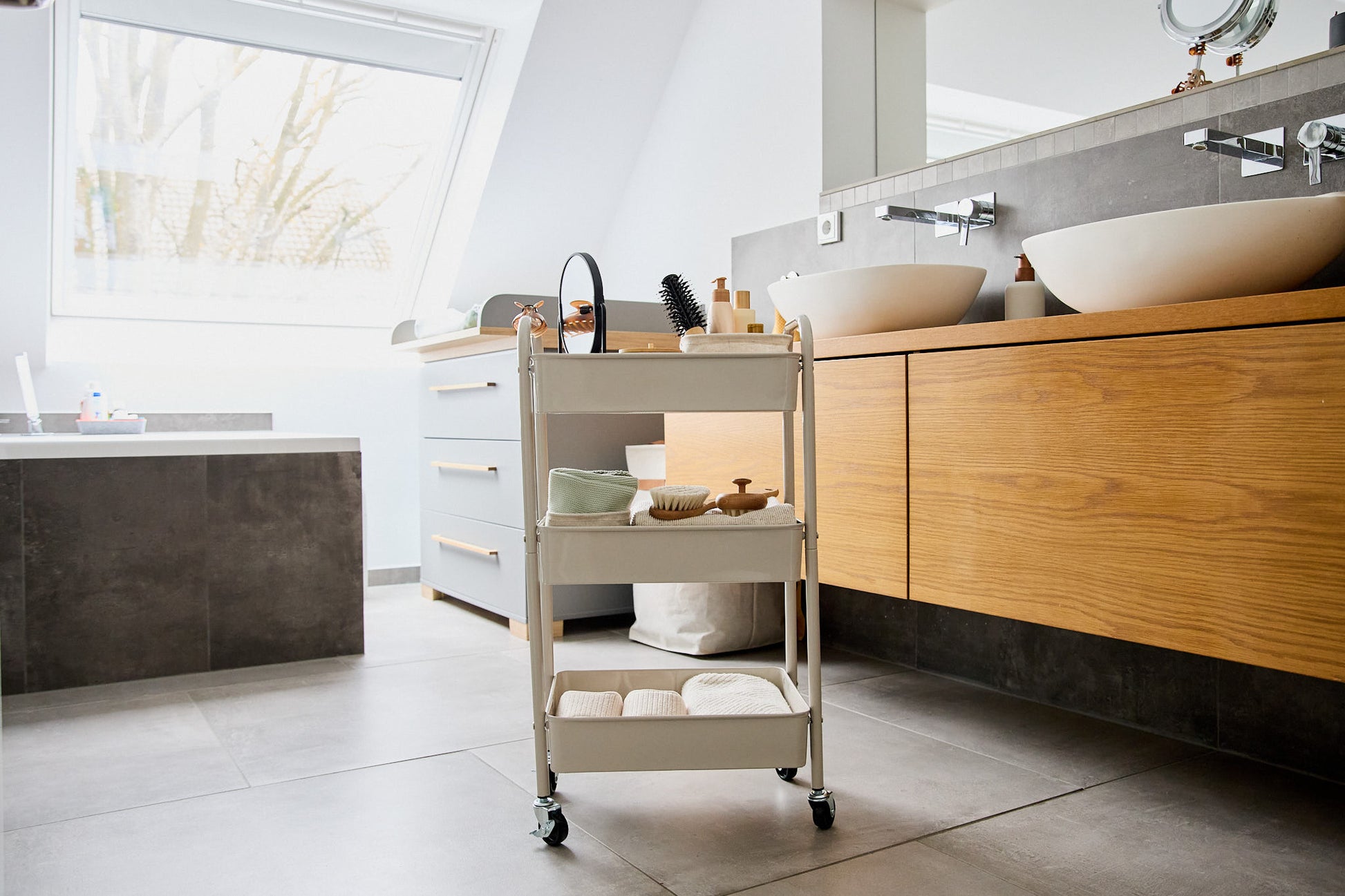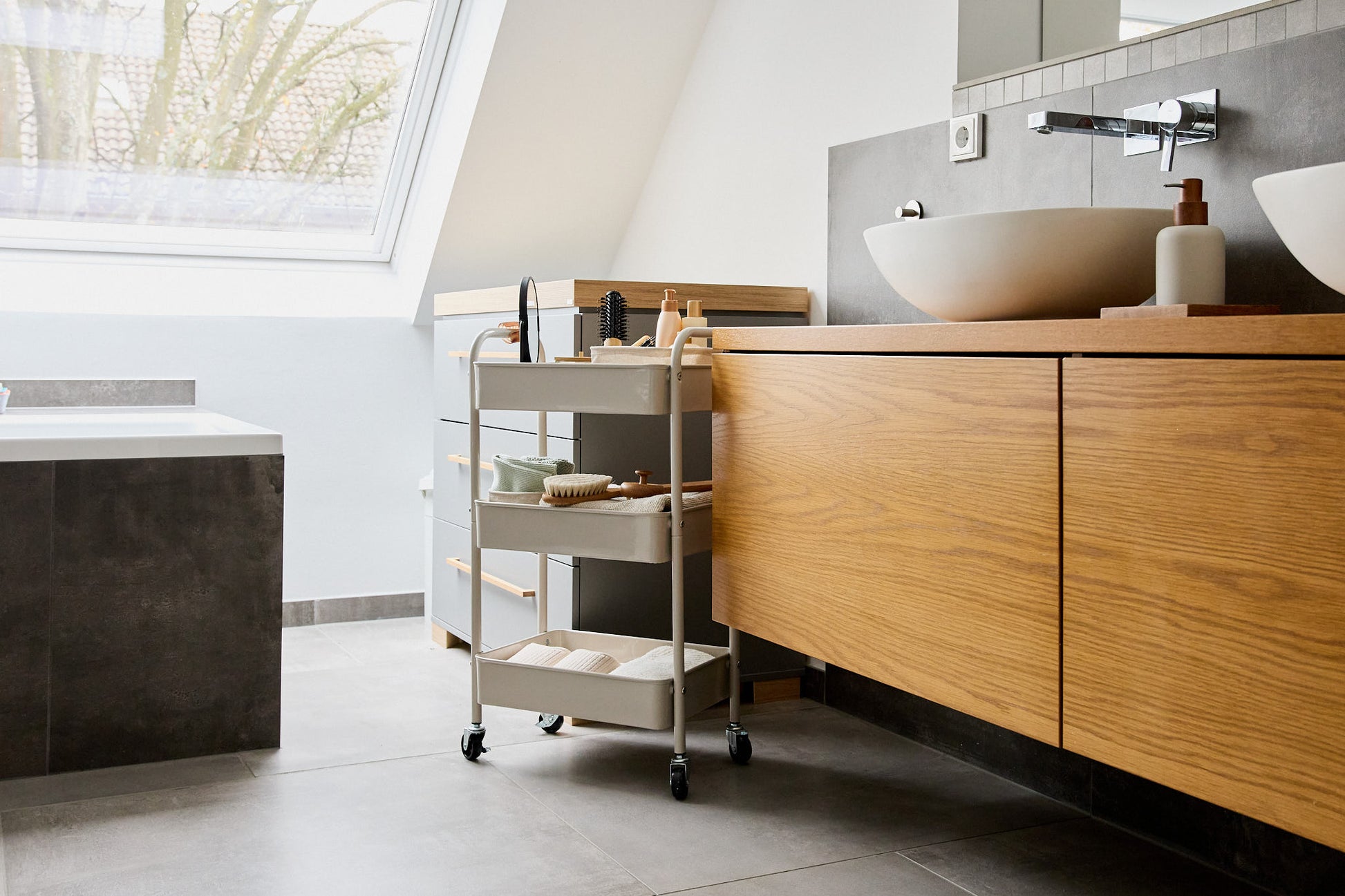 This 3-Tier Rolling Cart in grey is the perfect organizational solution for any space. With three spacious tiers, it offers ample storage for various items. Its sturdy construction and mobility make it ideal for use as a kitchen or bathroom cart, or for holding office supplies.