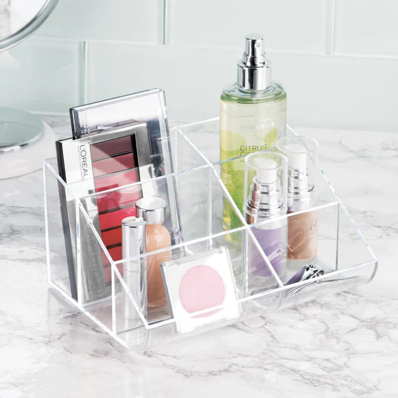 Features six compartments of varying sizes to store skincare, cosmetics, hair accessories, and other personal care items