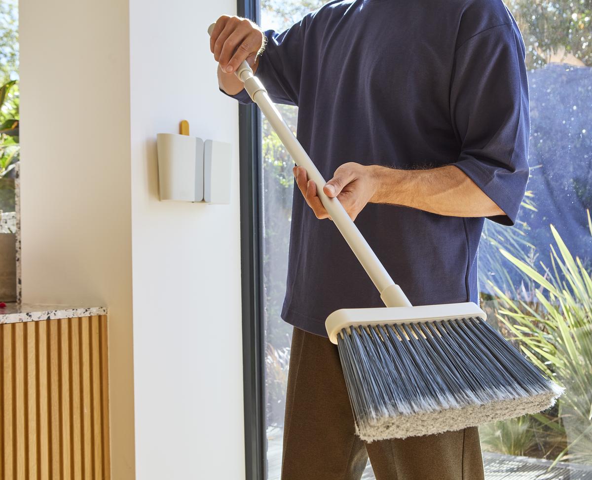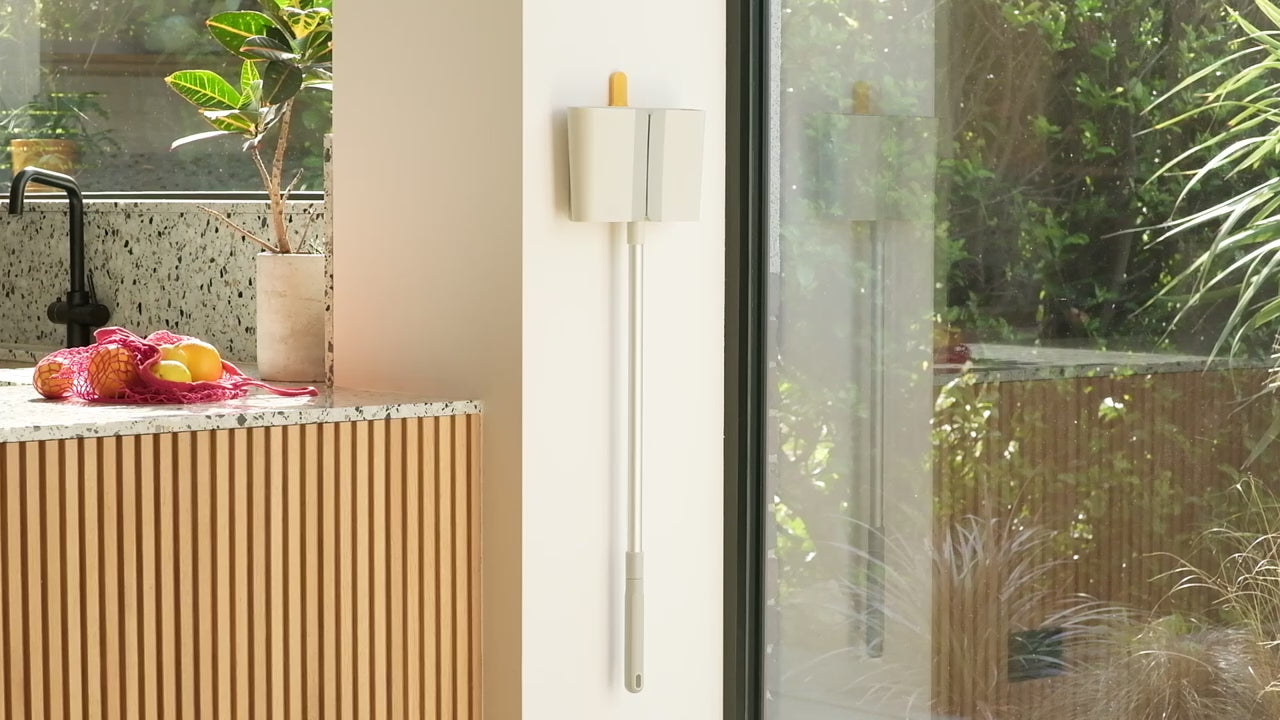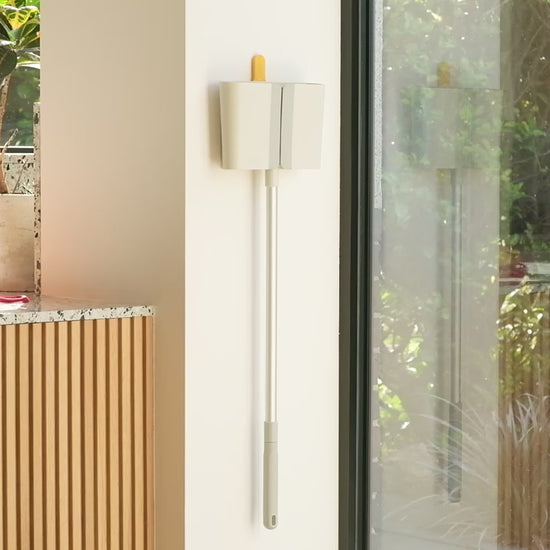 This broom features feathered bristles and a telescopic handle, stored in a Dust-shield™ holder that fully encloses the head to keep storage areas cleaner.