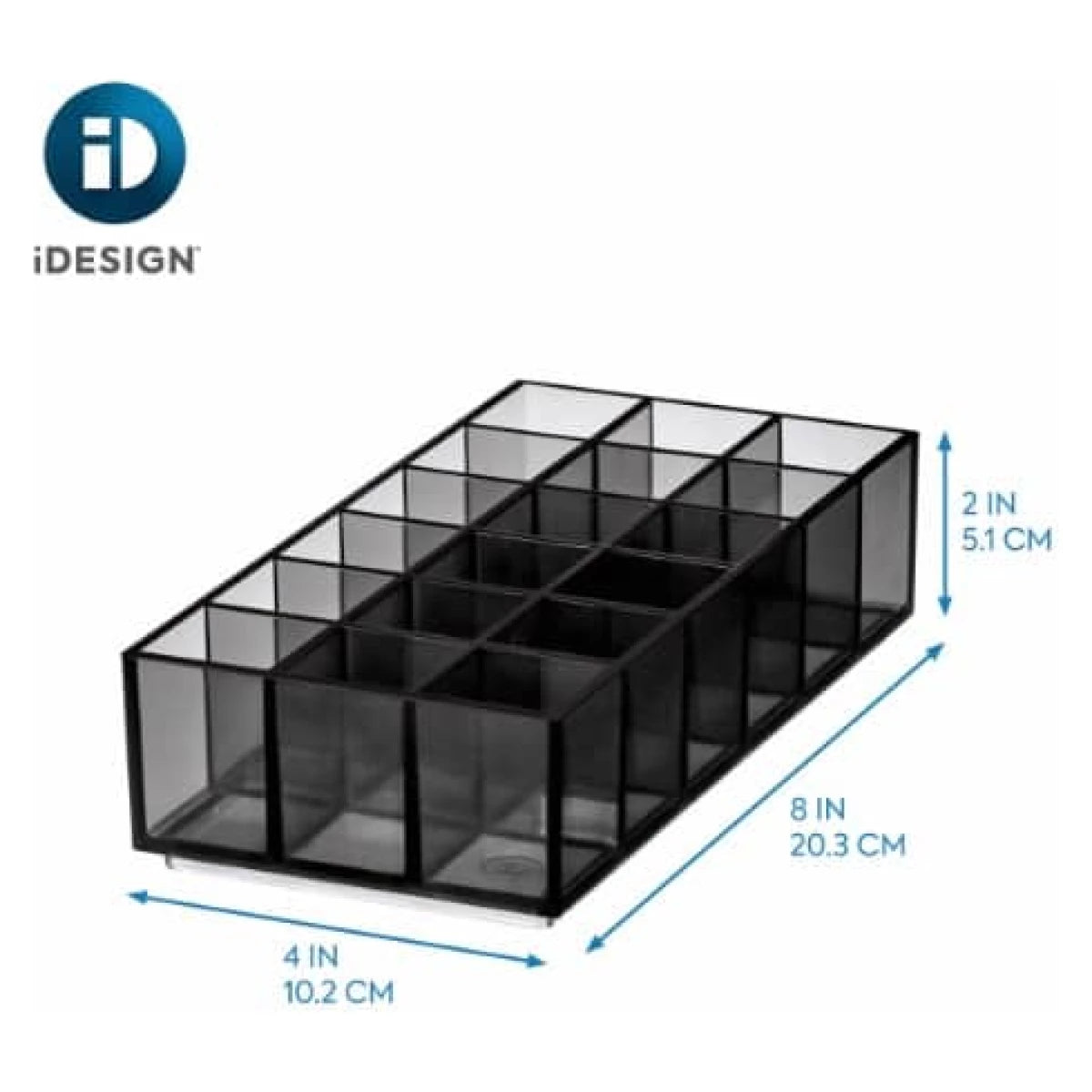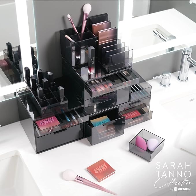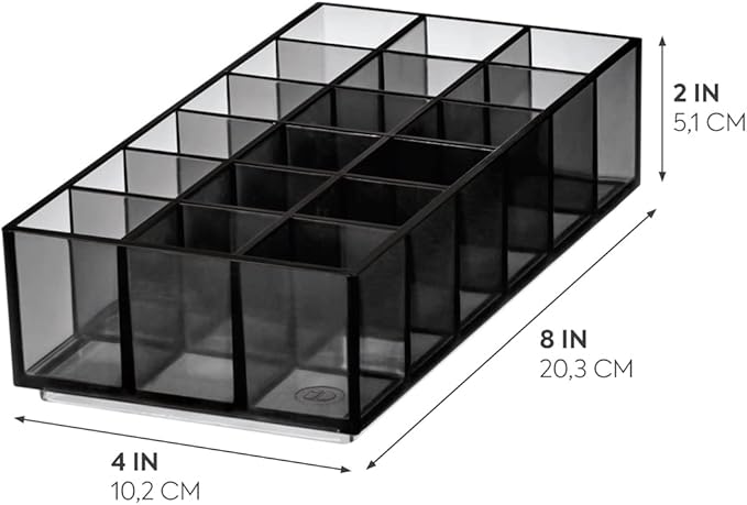 Keep your lip collection beautifully organized with this thoughtfully designed cosmetic station. Featuring 18 dedicated compartments, it displays your lipsticks and glosses with clarity while maintaining a compact footprint on any vanity. The transparent grey construction with black accents offers both functionality and aesthetic appeal. Built from durable recycled plastic, this holder integrates seamlessly with other pieces in the Sara Tanno collection—stack and combine them to create a customized storage solution tailored to your needs. At 8 x 4 x 2 inches, it strikes the perfect balance between capacity and space efficiency, ensuring your favourite shades are always visible and within reach.