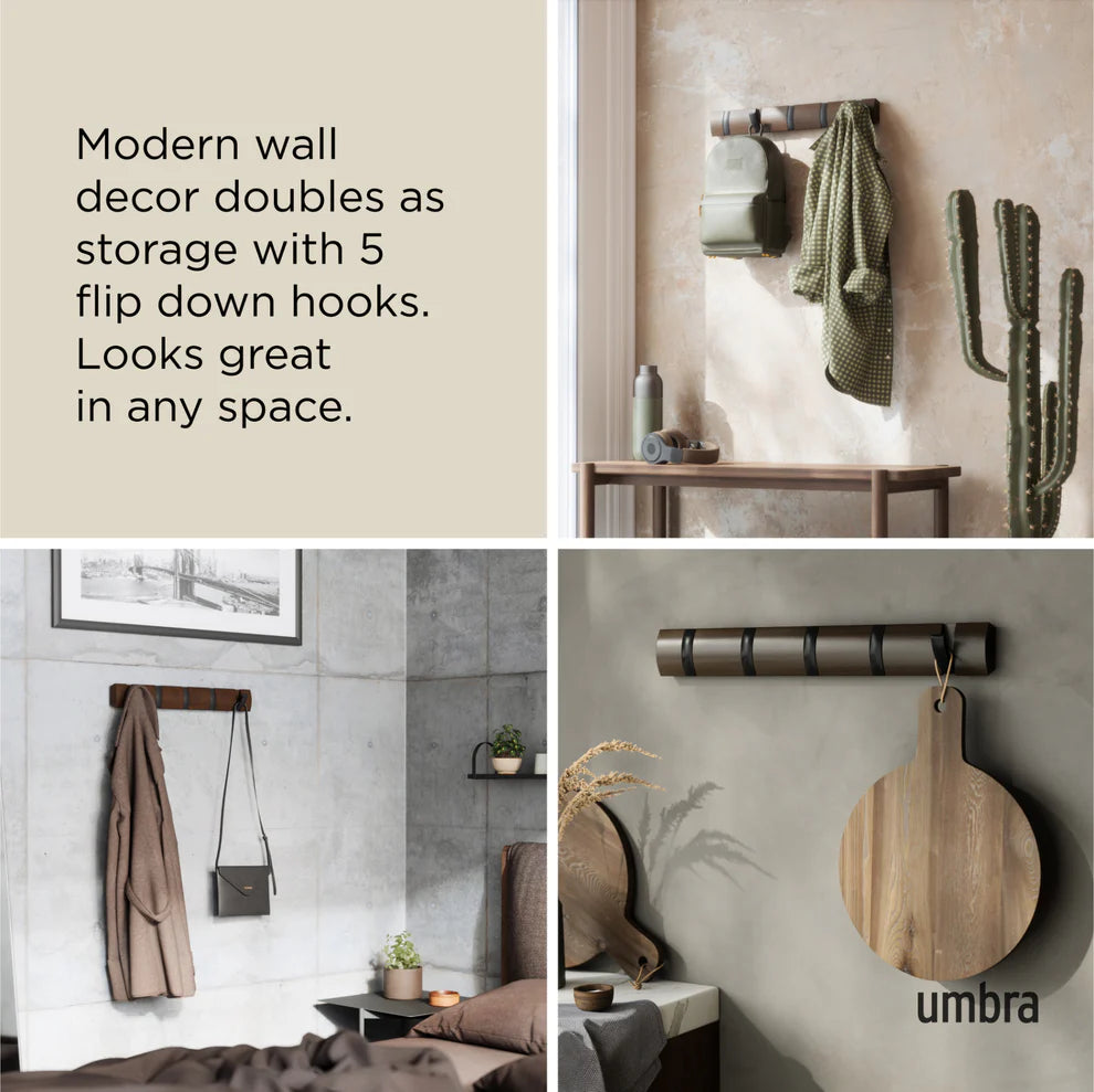 Easy To Set Up & Use:Designed by David Quan for Umbra, Flip® 5-hook wall mounted coat rack measures 20 x 2.75 x 1.5 inches and comes complete with simple step-by-step installation instructions and all the necessary hardware to easily mount it to your wall in just minutes