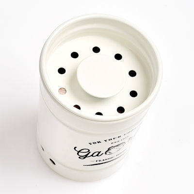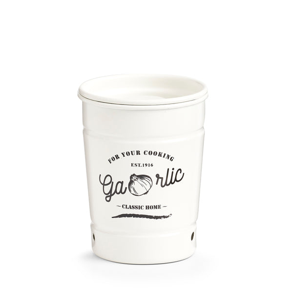 Garlic adds a special touch to many dishes and no household should be without it. However, this flavorful bulb is a little challenging to store. It should be kept in a dry, dark place, but there must still be enough air circulation. This white metal storage container is ideal for this and other vegetables with similar preferences. The lid is removable and, together with the side cutouts, ensures that heat doesn't build up and that natural air circulation takes place. Its attractive print also makes this storage container a real eye-catcher in any kitchen.