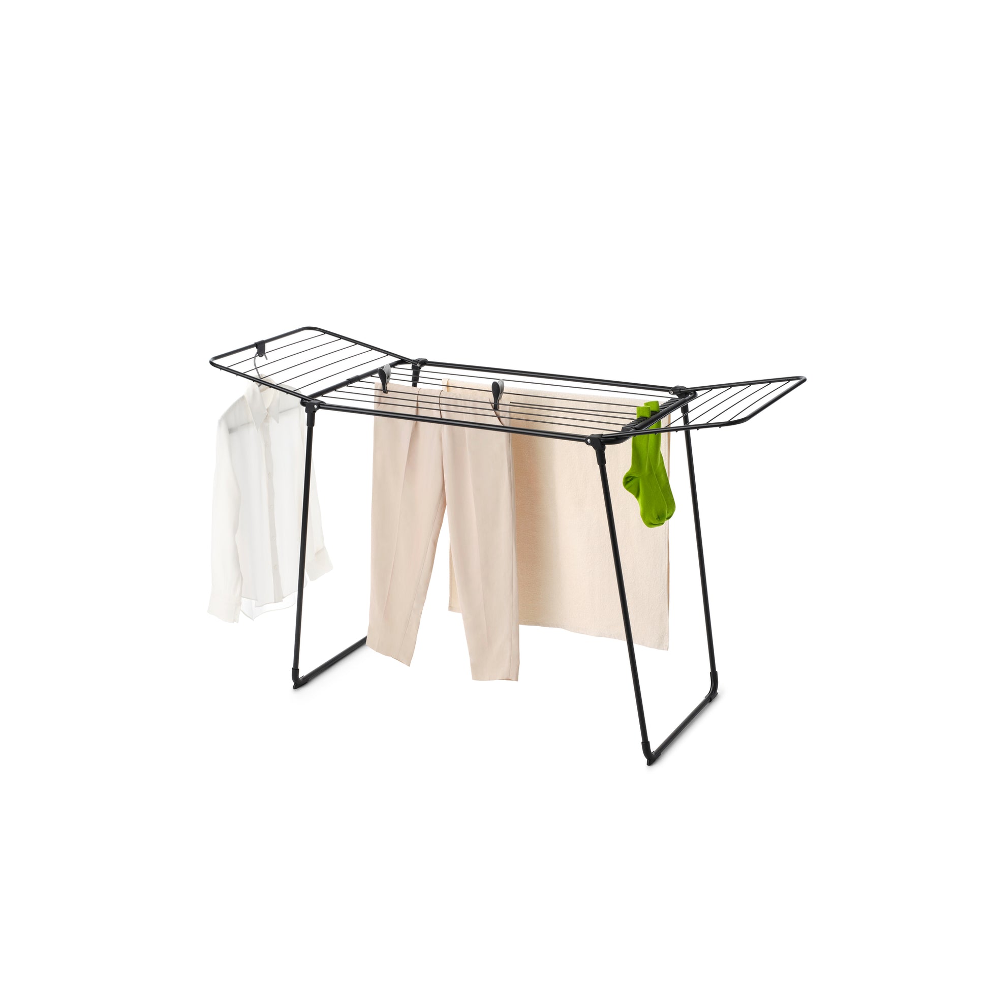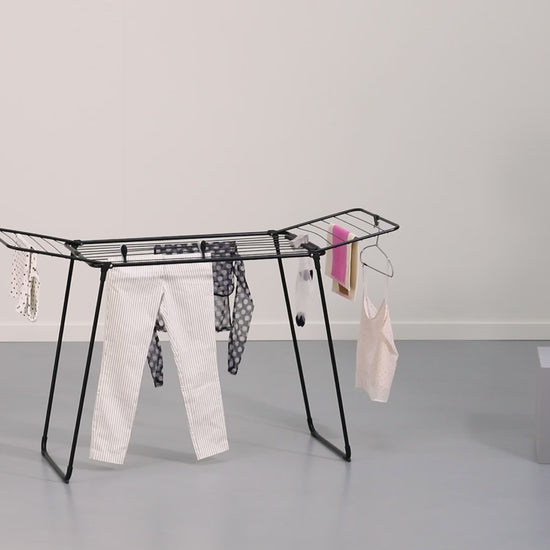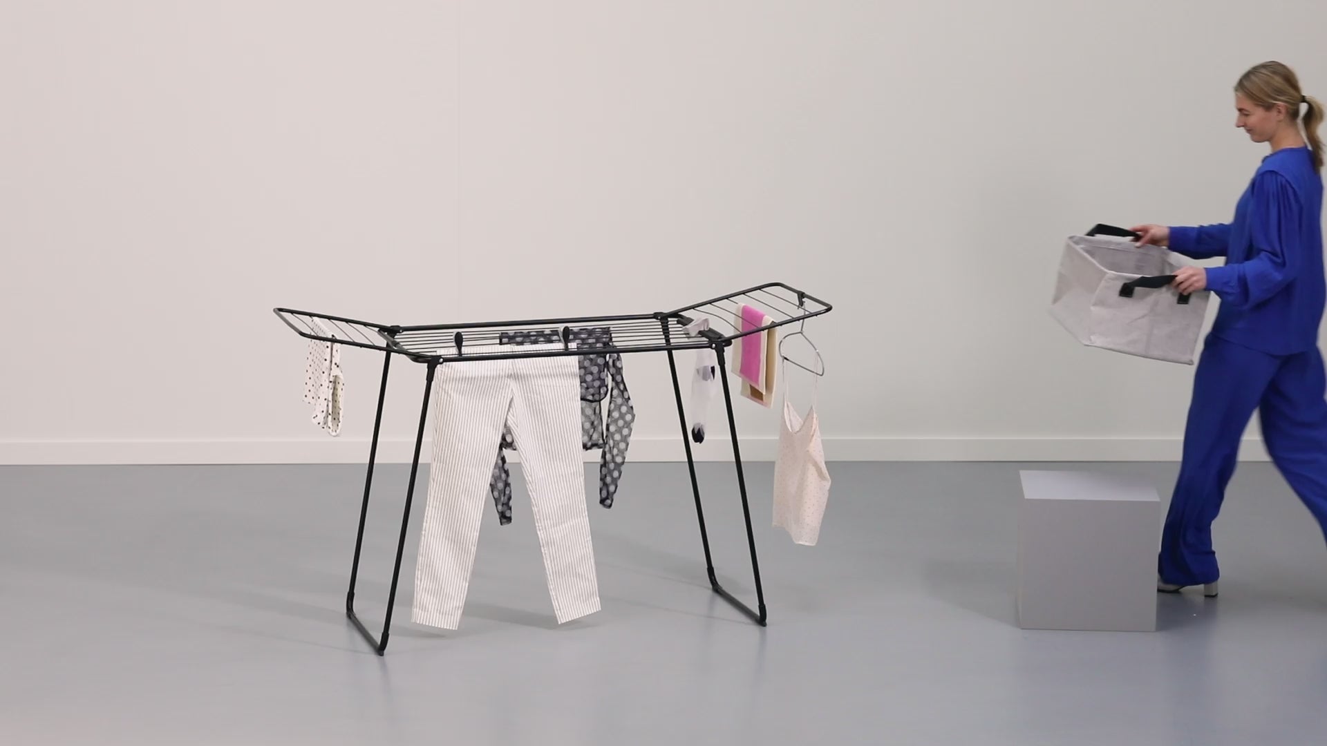 Save time and energy by drying your laundry naturally - and save space by hanging it on this smart rack! With 18 meters of drying space, and holder for small items likes socks, this Brabantia HangOn Drying Rack Too sure is spacious. Special feature: thanks to the extra space between the (wide) wires, laundry is easier to hang and dries quicker. Ideal for bigger items like towels. When all’s dried and done, you fold it flat for storage. The transport lock keeps the wings together, and doubles as a hook for hangers. By buying this rack, you are also supporting WeForest to plant more trees. Wanna hang out?