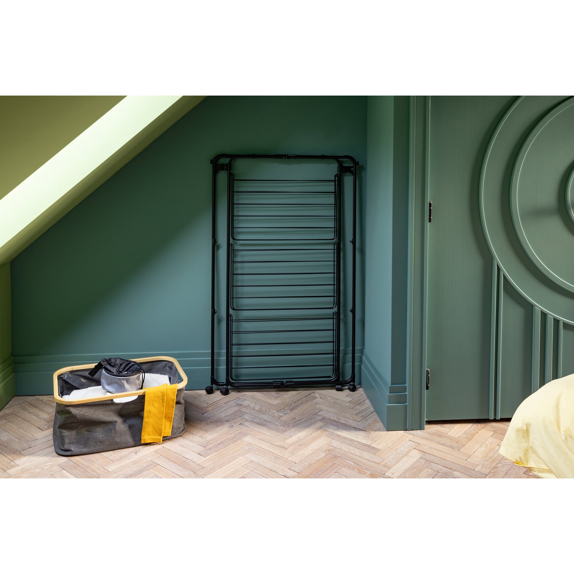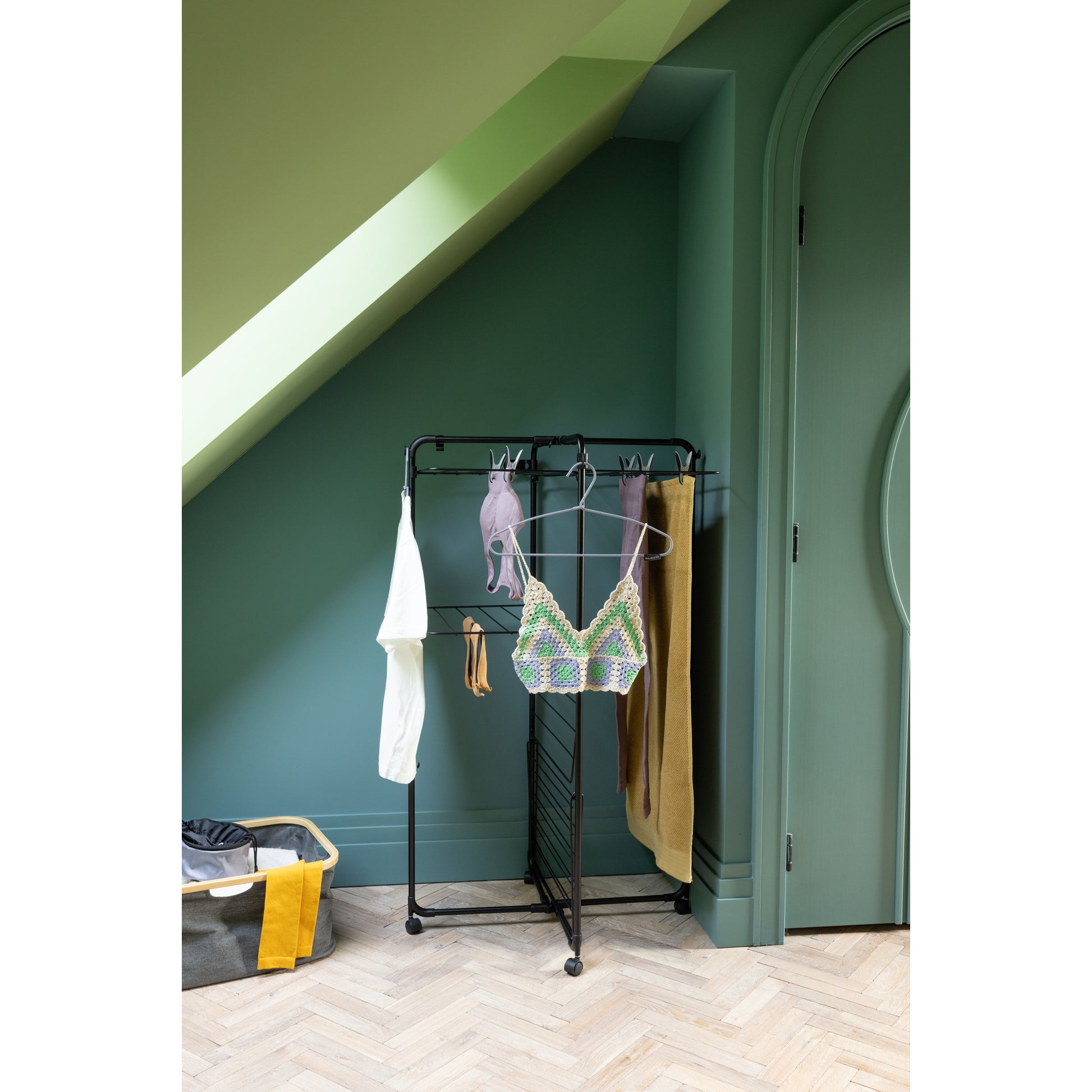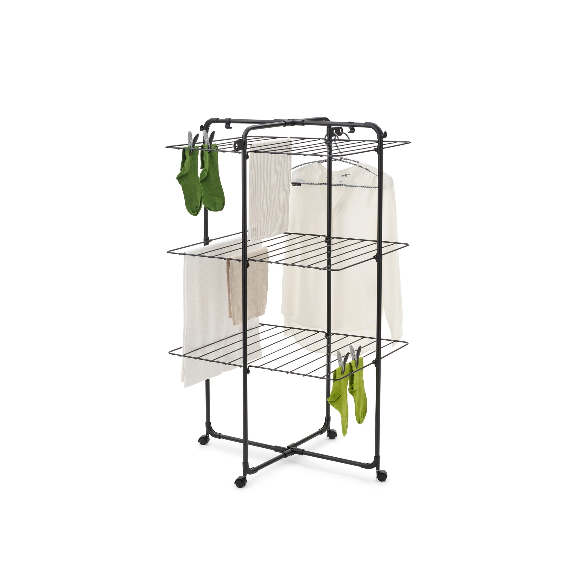 Save energy by drying your laundry naturally, and save space by hanging it on this Brabantia HangOn Tower Drying Rack! With 23 metres of flexible drying space plus extra hooks and holders for clothes hangers, this smart drying rack occupies minimal floor space - a true space-saver. It features three drying levels that can each be folded as needed, making it suitable for long items like towels too. The four wheels make it rotatable and mobile. When all’s dried and done, it folds up flat for compact storage. The transport locks keep the frame together, and double as hooks. By buying this rack, you are also supporting WeForest to plant more trees. Wanna hang out?