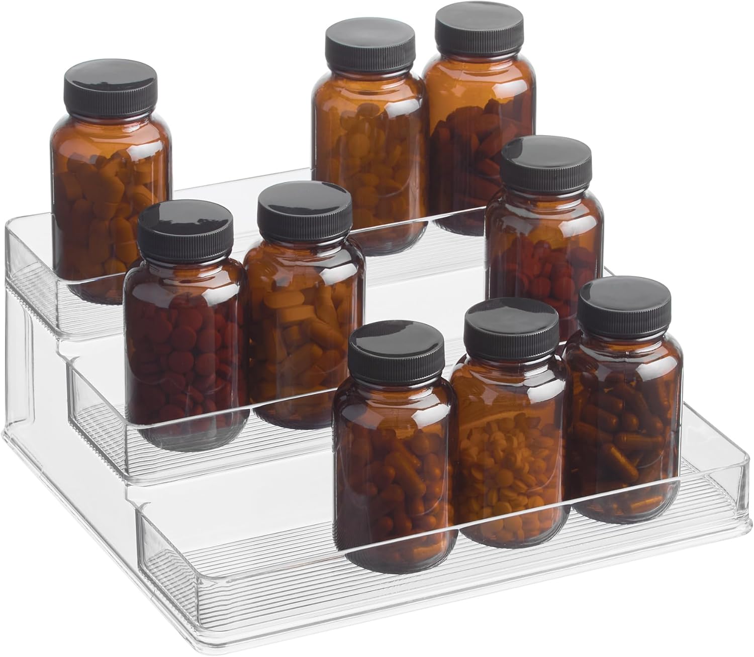 Free up some space in your crowded cabinets and pantries with this Linus 3 Tier Stadium Spice Rack 1 by InterDesign. Tiered for easy viewing and identification, this organiser makes the most of the space you have. Made of strong and sturdy resipreme, this innovative kitchen helper will organise all your favourite spices and condiments. This functional tiered shelf fits comfortably inside the average kitchen cabinet for convenient access. The unique tiered shelf is also great for vitamins and medicines.