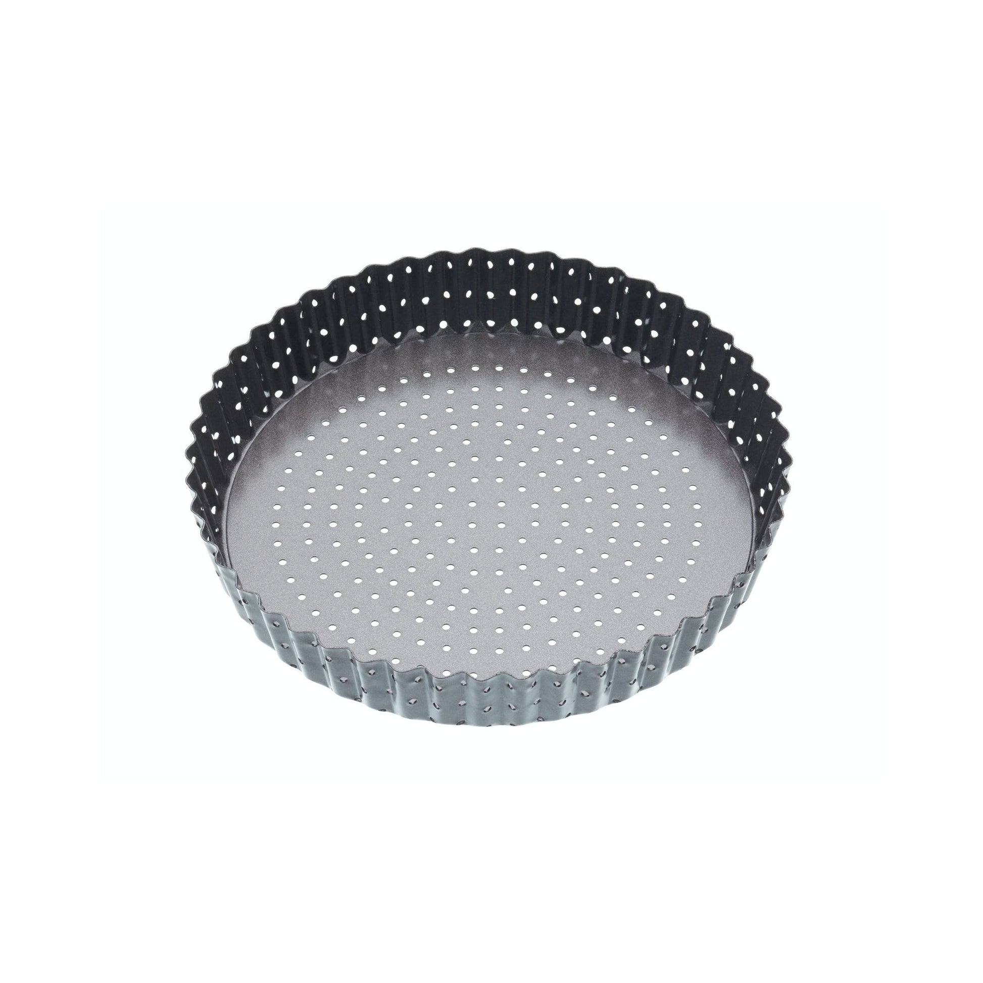 With this non-stick, loose base, fluted round quiche tin make delicious quiches, flans, and tarts. The perforated holes along the base and sides ensure that the air circulates easily during the cooking process and with the perfect golden-brown, crisp crust, you can make fruit flans and savoury quiches. Let us banish for ever the soggy edges!