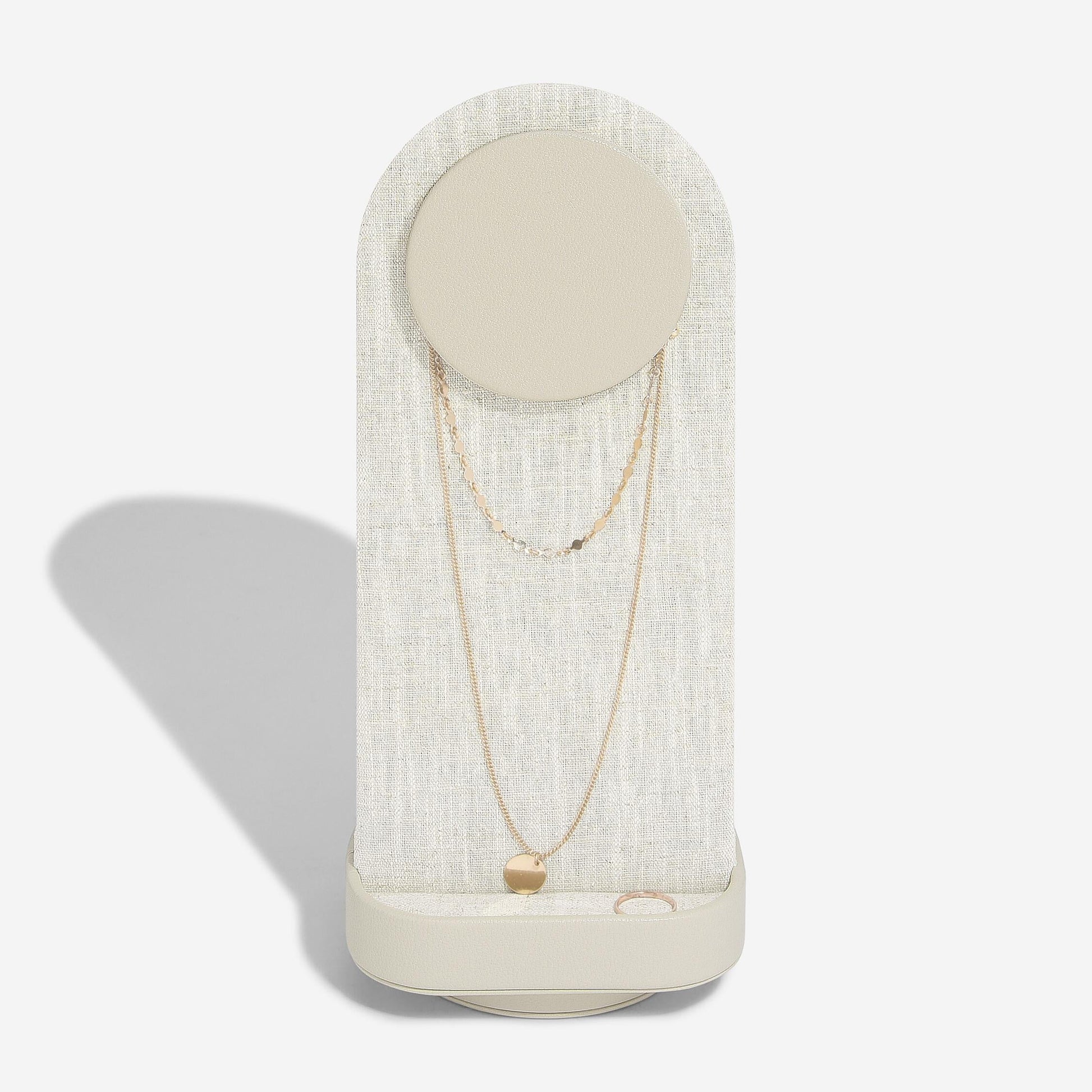 Enjoy a clutter-free dressing table with the Stackers Rotating Jewellery Stand. The organiser rotates so that you can always easily access your jewellery, with display options for necklaces, earrings and rings. Finished in a neutral Oatmeal PU and Linen mix, to complement your home.