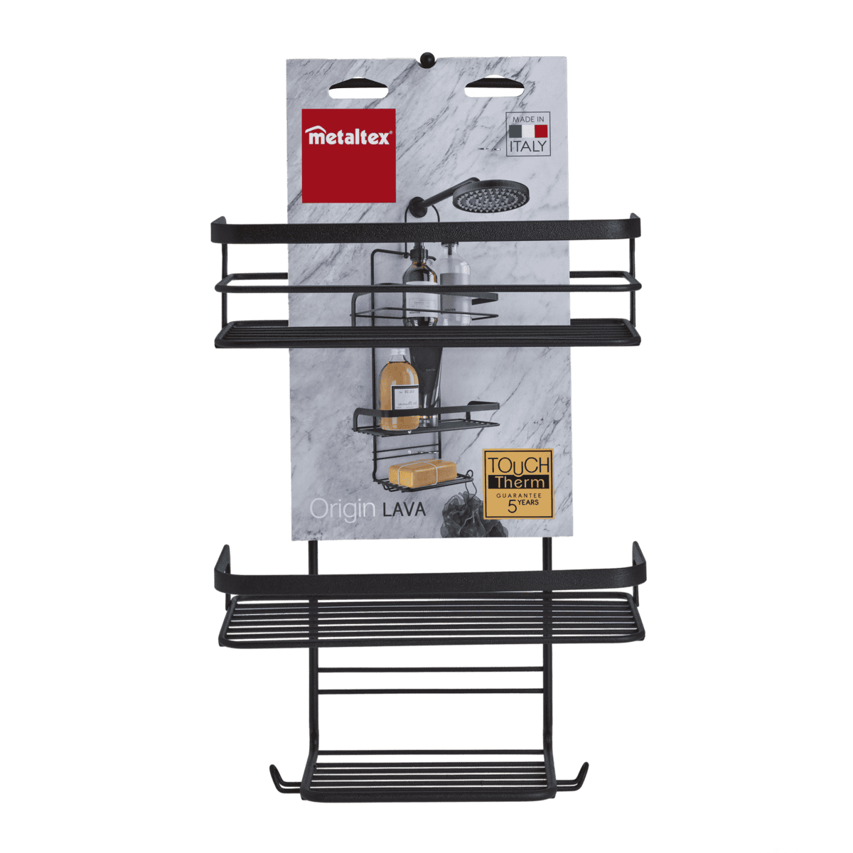 The Origin Lava Shower Cava in Black is a premium shower caddy designed for convenience and durability. Crafted in Italy, it features a sturdy hook and suction cups for secure hanging, adapting easily to your shower space. Its Touch Term Coating ensures a sleek, easy-to-clean surface that resists wear, backed by a 5-year guarantee for lasting quality.