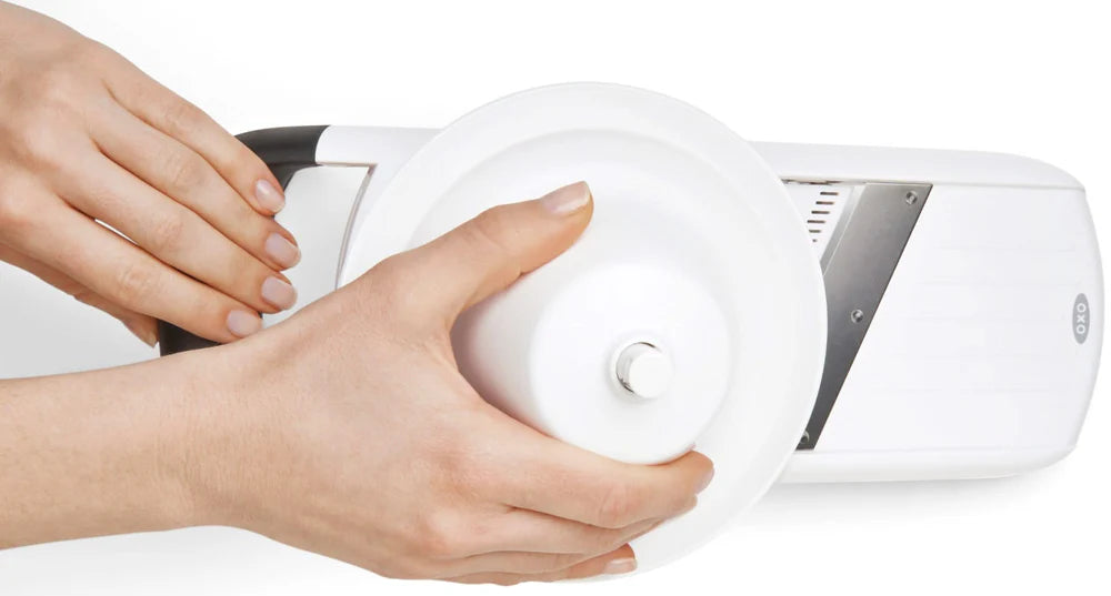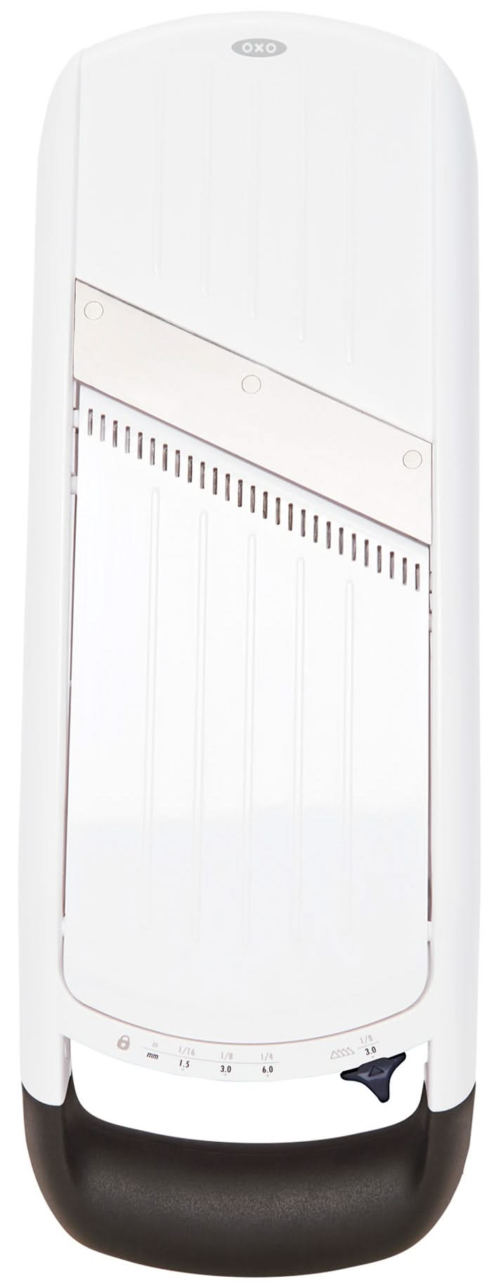 With the OXO Basic Mandoline, making a salad, an apple pie or a potato gratin will become not only easy, but also a lot of fun. You can easily adjust the cutting thickness to your liking with the knob on the side. You can set the cutting thickness to 0.16 cm, 0.32 cm and 0.64 cm. You can safely cut the food by securing it in the holder. Also, the OXO Hand-Mandoline has non-slip feet. So you can, for example, let it rest on a bowl so that the ingredients fall evenly into the bowl end up.