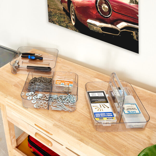 This elegant stacking organizer offers a sophisticated solution for transporting essential items. Featuring three transparent layers that nest seamlessly together and a convenient handle, it allows for effortless visibility of contents. Versatile in application—suitable for tools, crafting supplies, or cosmetics—this recycled clear container combines practicality with refined design.
