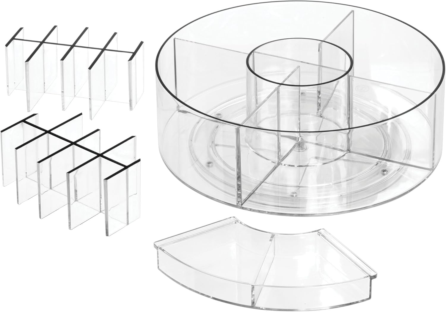 - ELEVATED STORAGE - With a gentle, one-handed push, our iDesign Rotating Makeup Organizer streamlines your daily routine; Crafted from crystal-clear plastic, varying compartments allow you to sort and organize everything from toiletries to cosmetics, creating an organizational solution with space and flexibility to accommodate your growing storage needs