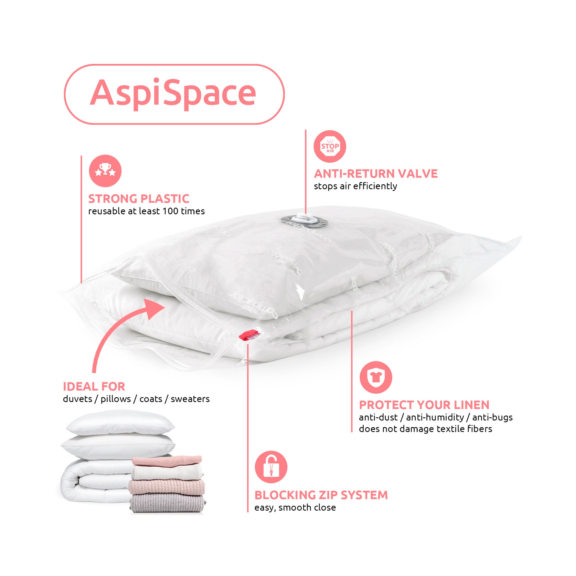 Maximise the space and save up to 75 percent in your cupboards, drawers and suitcases, Ideal for storing clothes, duvets and household linen over a long period of time.