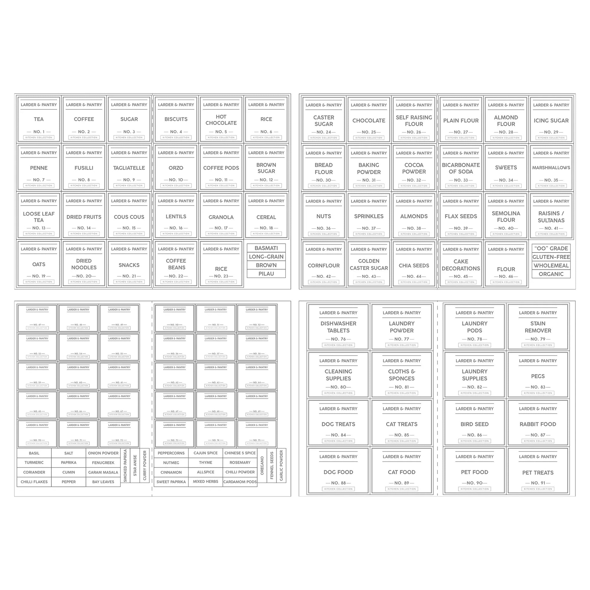 The set includes 4 A4 label sheets that covers an array of categories including pantry essentials, baking, spices and laundry & pets.