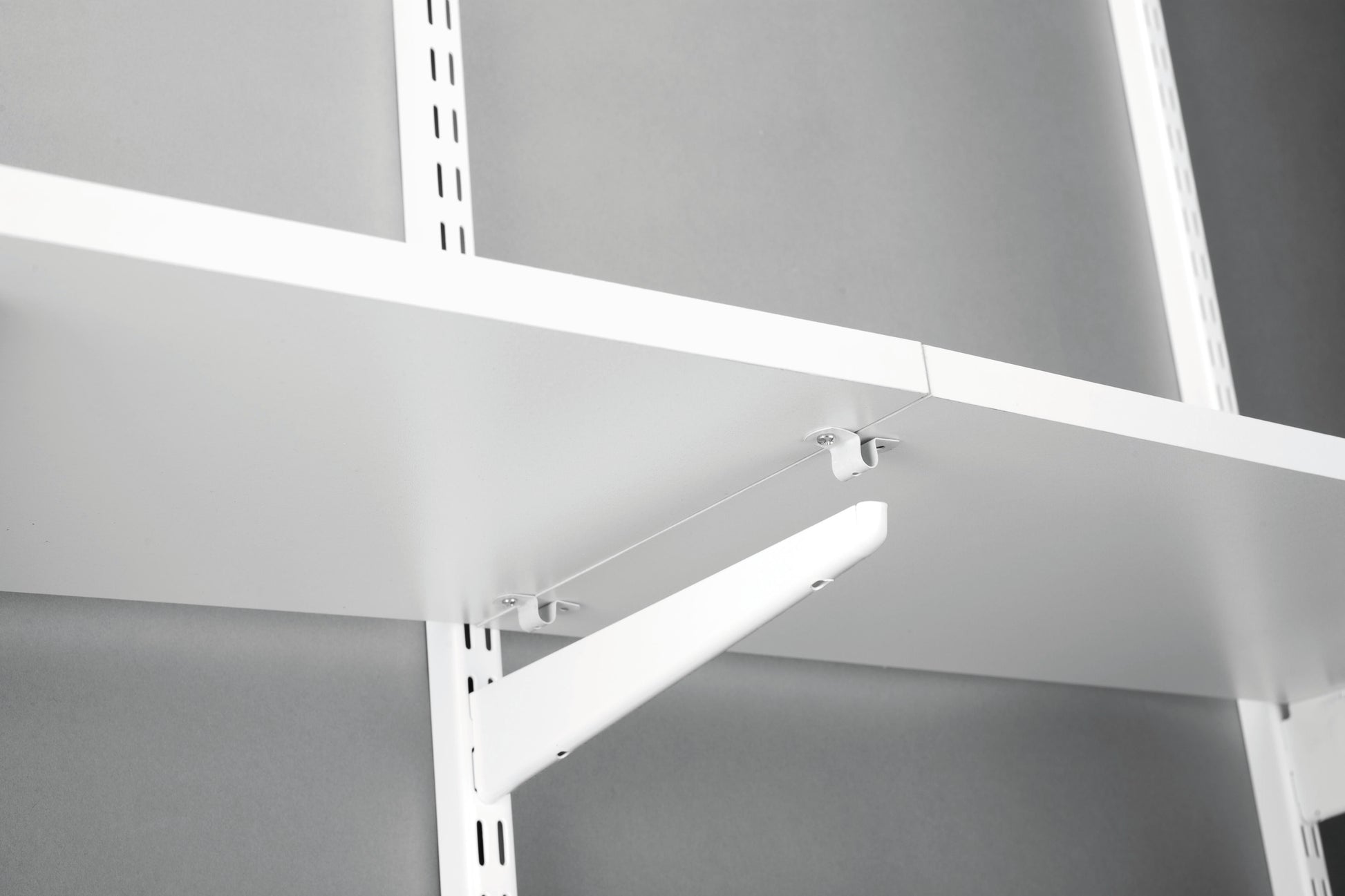 Shelf joiners, used to connect two melamine shelves in the same depth on one bracket for solid shelf. Screws are included. Come in a 6-pack.