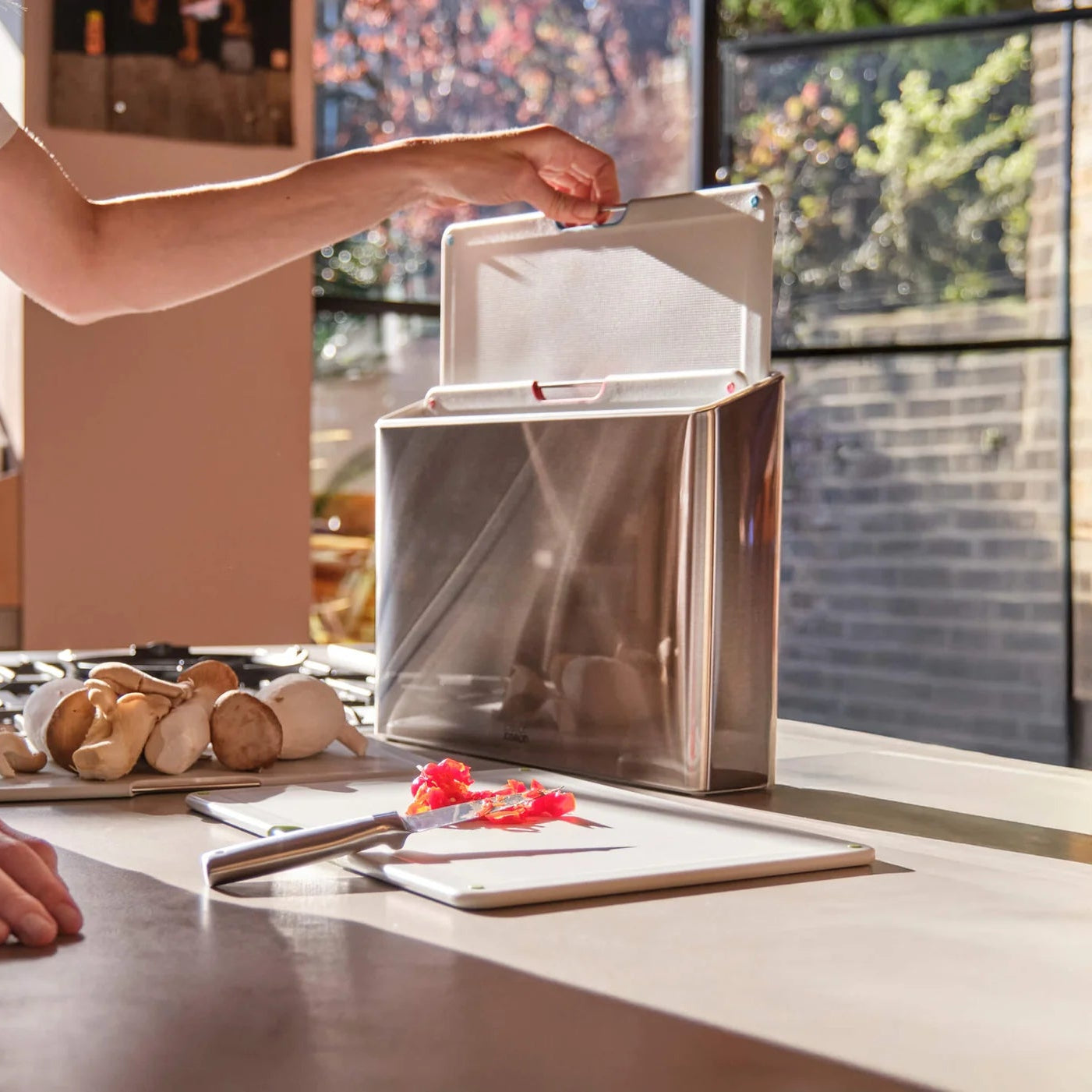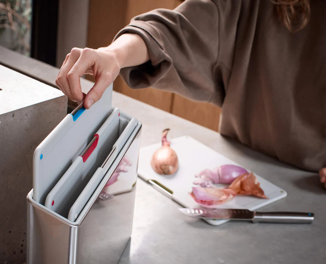 Upgrade your kitchen with this sleek 4-piece chopping board set. Colour-coded boards with non-slip feet are housed in a stainless-steel case that keeps them organised and allows for airflow.