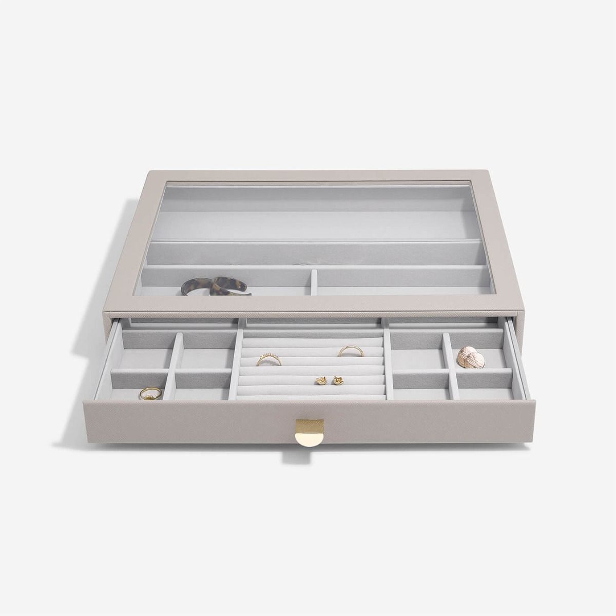 The Supersize Glass Lid Drawer is the perfect starting point to your jewellery box or as a stand-alone piece on your dresser. Designed with a glass lid to display your jewellery beautifully, and soft velvet lining so keep your jewellery safe and protected. Keep your favourite jewellery beautifully organised with versatile compartments for your rings, earrings, necklaces and bracelets.