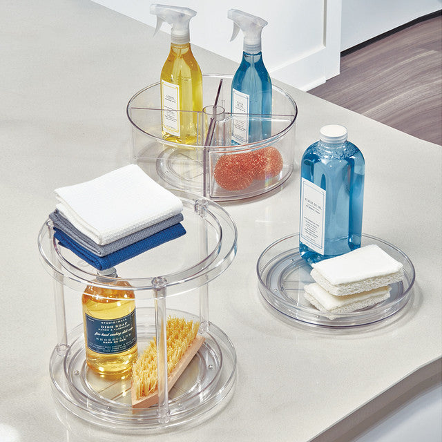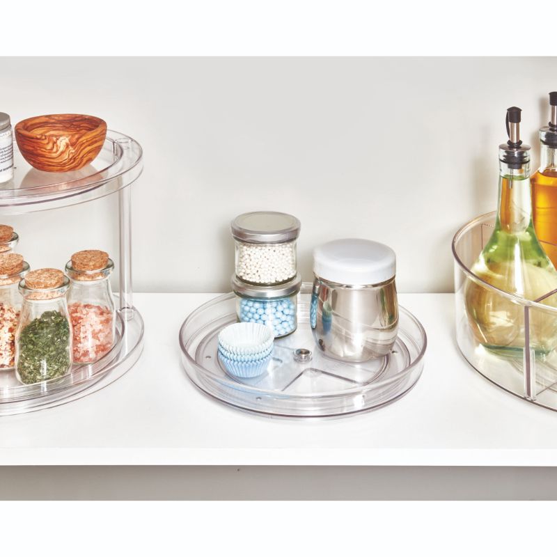 iDesign This 9″ Lazy Susan can be the secret to effortless organization. Its 9″ size is ideal for smaller spaces. Use it to store everything from spices, seasoning packs and condiments to craft supplies and bath necessities. It’s exceptionally durable, with a clear, clean look that’s perfect for a clutter-free cabinet or pantry.