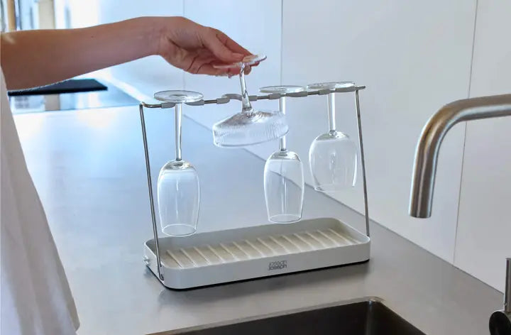 Keep delicate glassware safe with this folding wine glass drying rack. Designed to hold up to four wine glasses, it prevents clinking and watermarks, and folds flat when not in use.