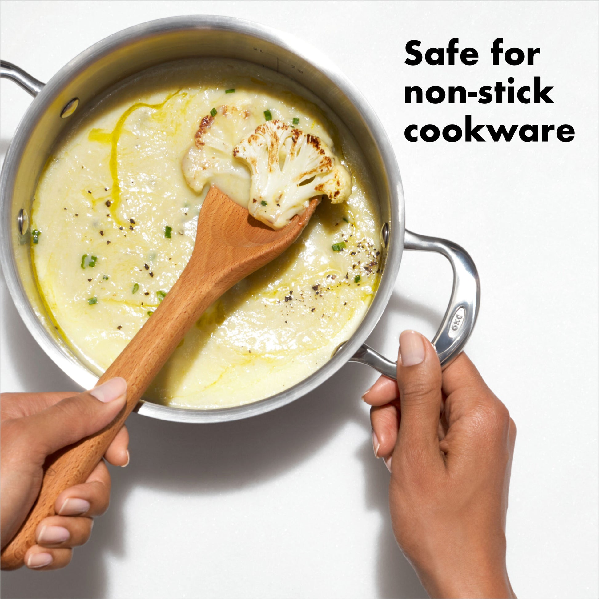 The OXO Good Grips Wooden Large Spoon is your go-to tool for stirring soups, chopping ground meat and serving pasta dishes. The solid, one-piece beechwood construction is sturdy and safe for non-stick cookware. A natural oil finish protects the wood for long-term use. The large handle is comfortable to grip and has an opening for neat hanging storage. Hand wash only.